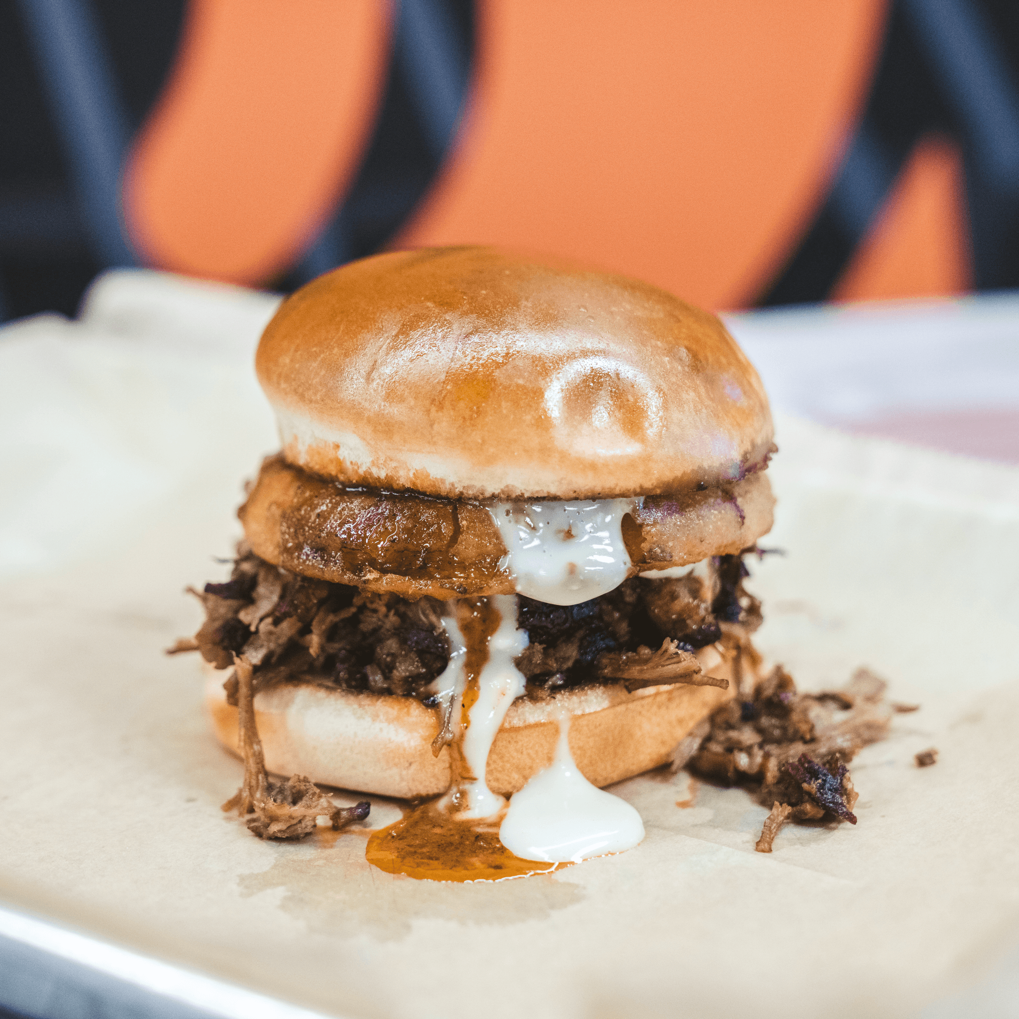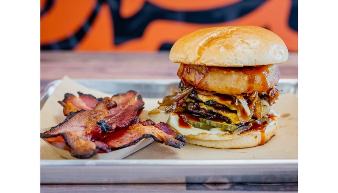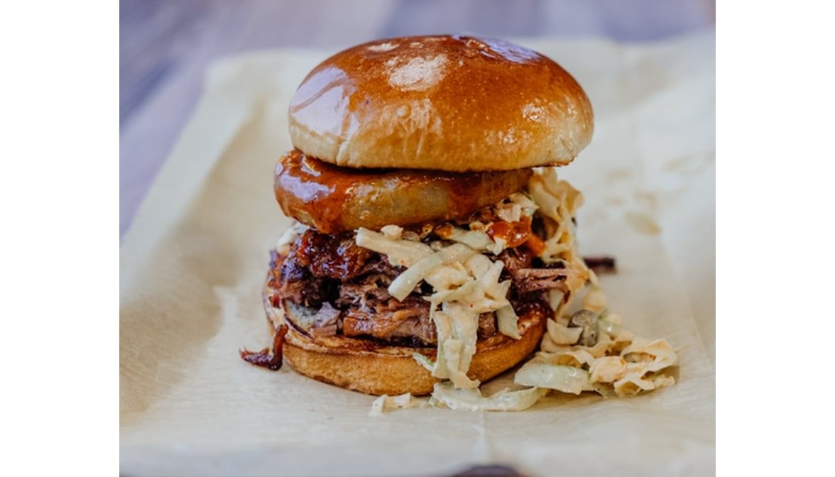 We take our burnt ends sandwich, add a beer-battered onion ring, spicy slaw and Nashville Hot Sauce. It's a smokey and spicy experience!