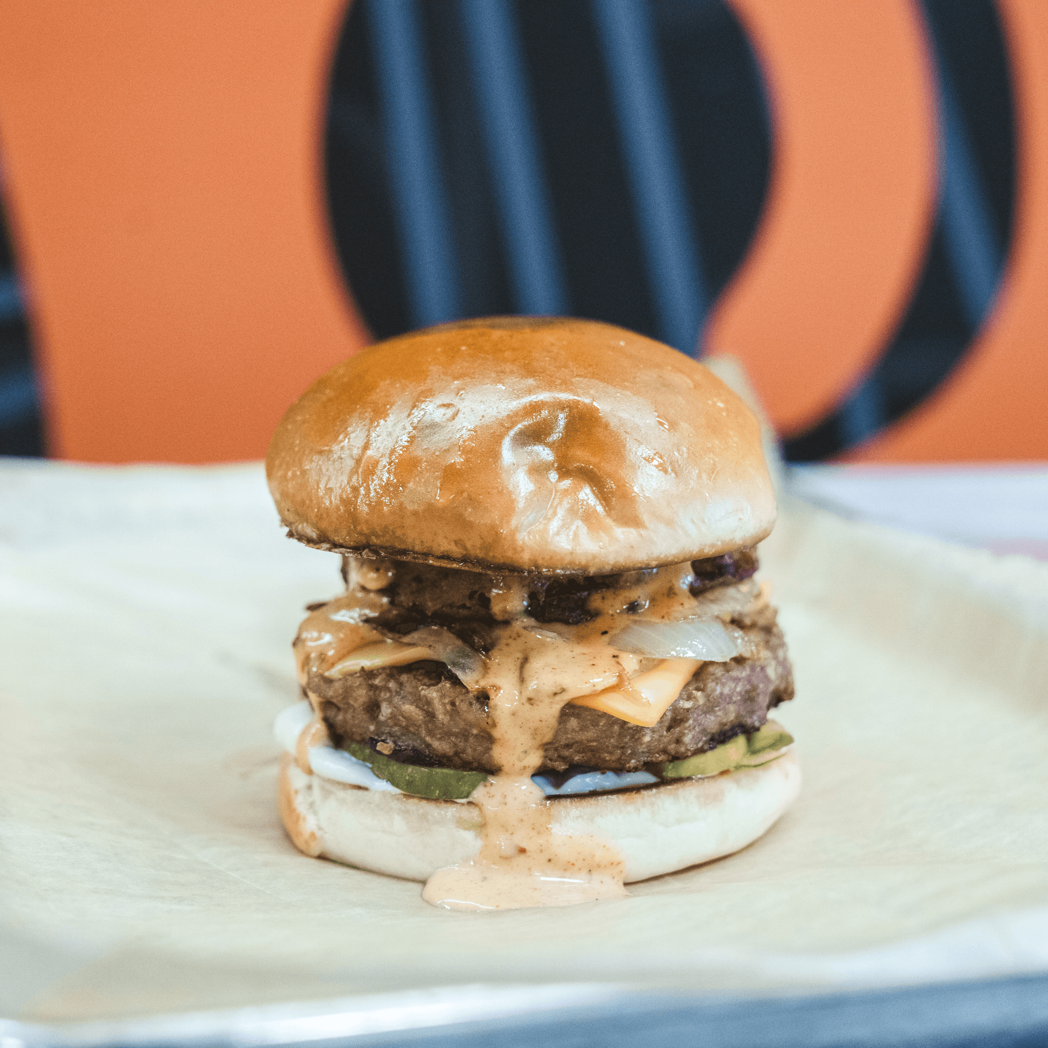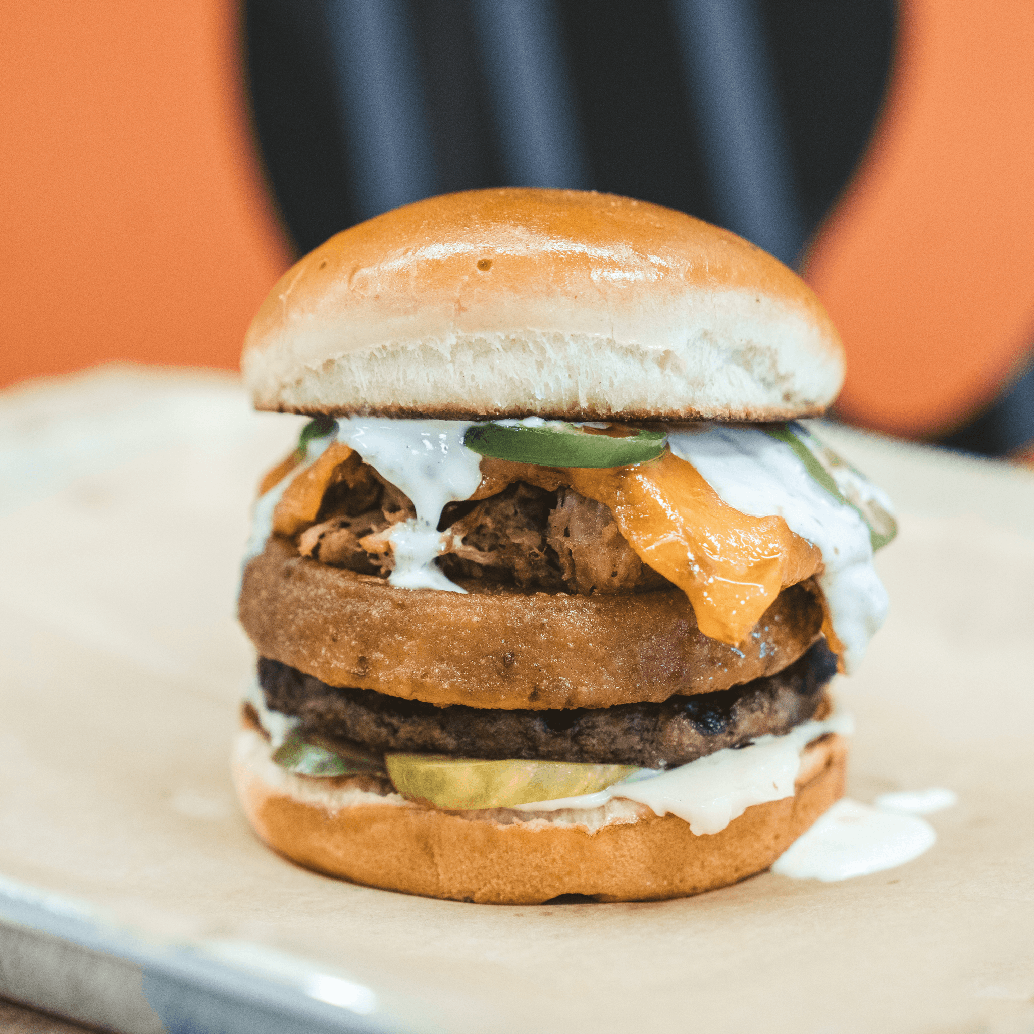 Our Julius plant-based burger topped with beer-battered onion rings and horseradish sauce.