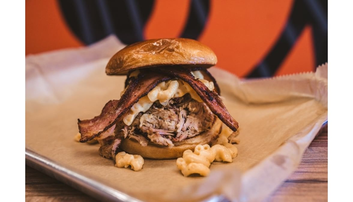 Hickory-smoked Beef Brisket piled high on a toasted brioche bun with 3-Cheese Mac and house-smoked bacon. Don't forget to choose your BBQ sauce!
