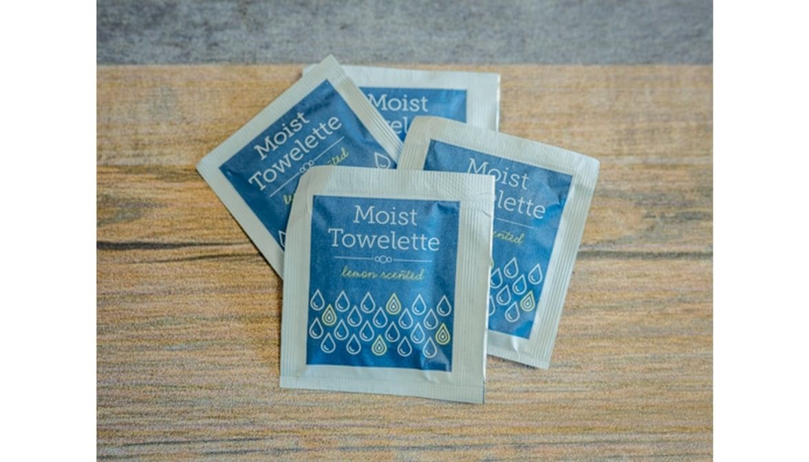 Individually wrapped lemon-scented moist towelettes for convenient hand cleaning