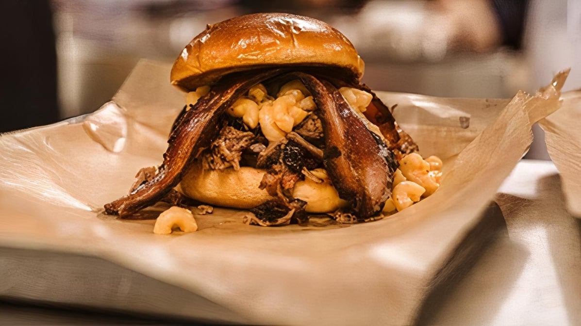 Two slices of white bread stuffed with house-cured thick-cut bacon, American Cheese, house-made pickles and 18hour smoked pork BBQ!