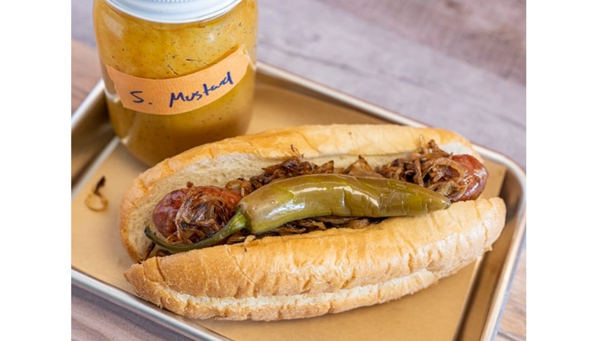 Hickory-smoked Kielbasa sausage stuffed between two slices of white bread, house-cured and smoked thick-cut bacon, American cheese and house-made pickles