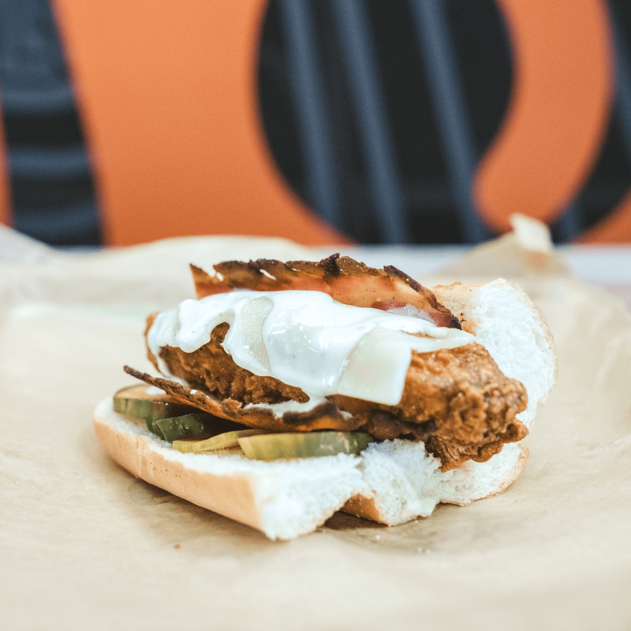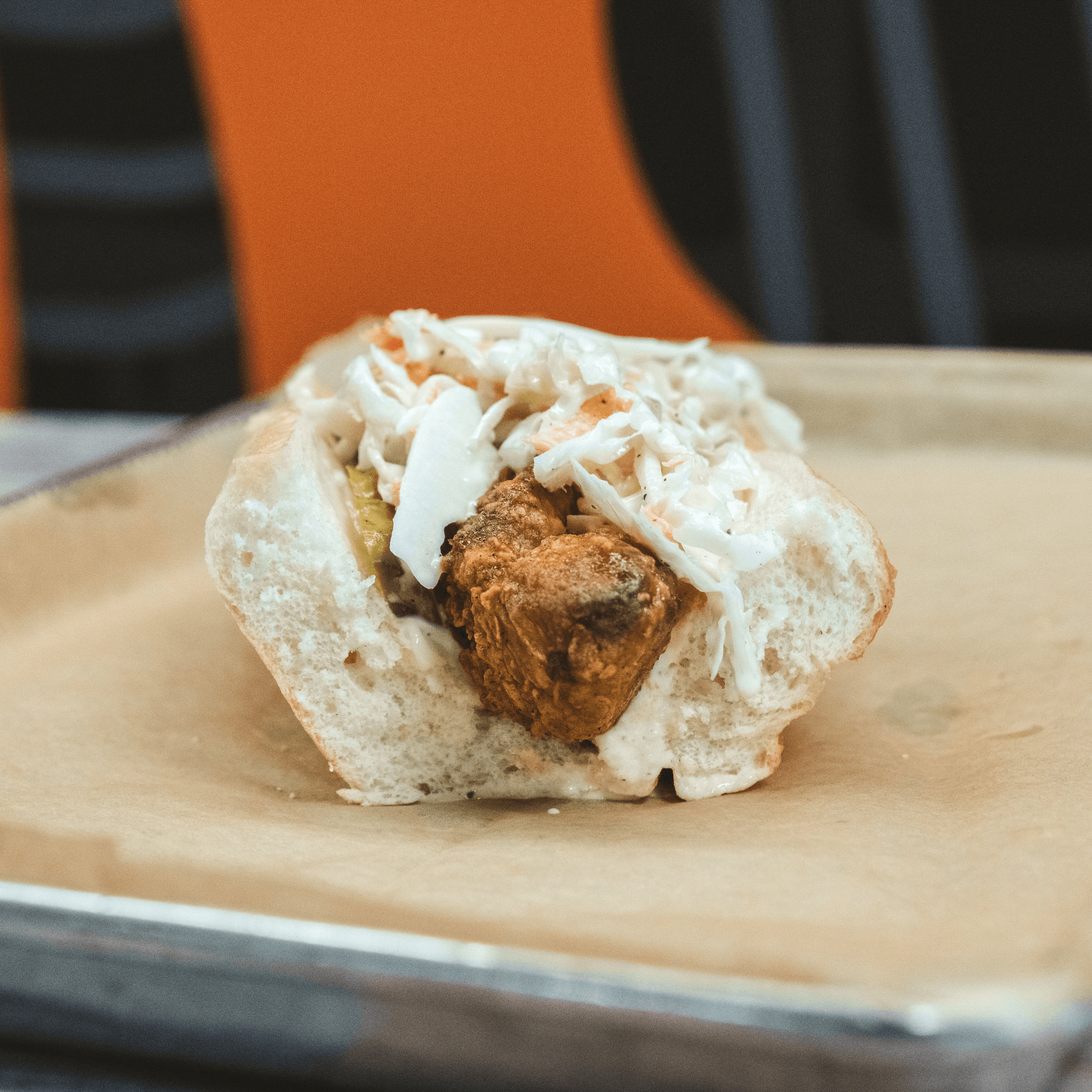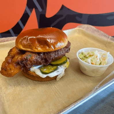 We take one of our awesome Nashville style chicken tenders and put it on a soft roll with mayo, house-made pickles and spicy coleslaw!