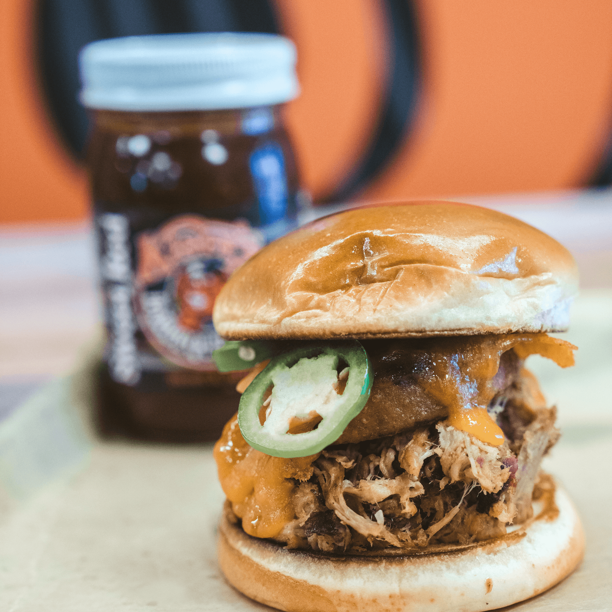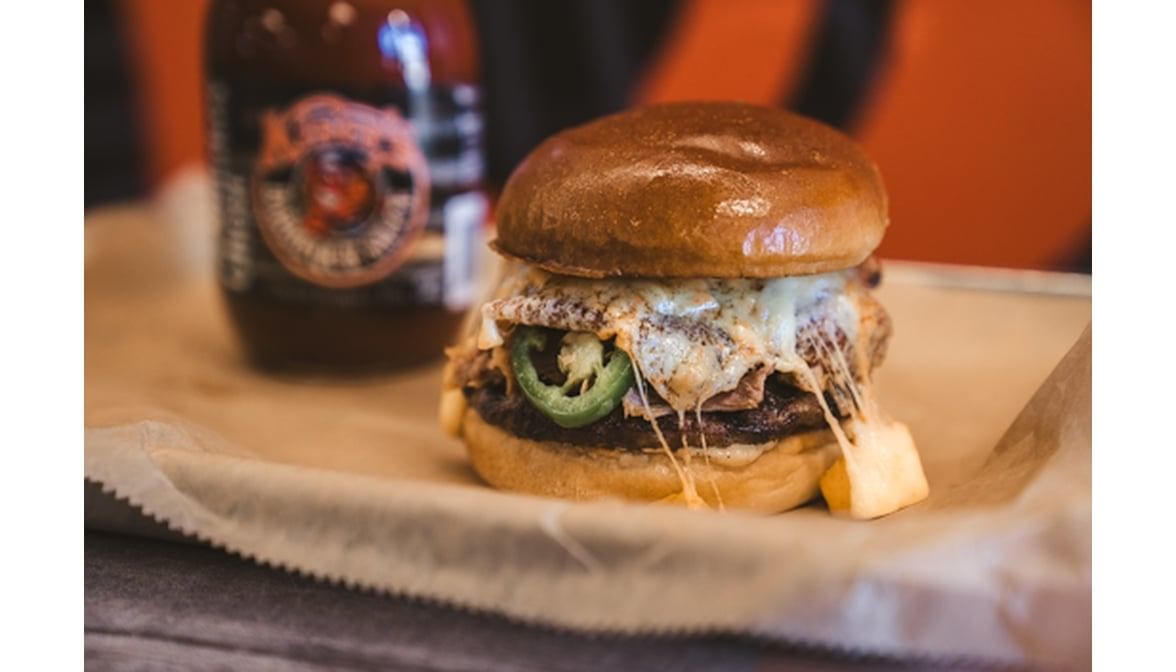 A char-grilled burger comes on a toasted brioche bun with mayo, house-made pickles, hickory-smoked pork BBQ, fresh jalapenos and buffalo-jalapeno cheese curds from Laurel Valley Creamy. Choose what BBQ Sauce you want, but we highly reccomend Habby or Smokey Ghost