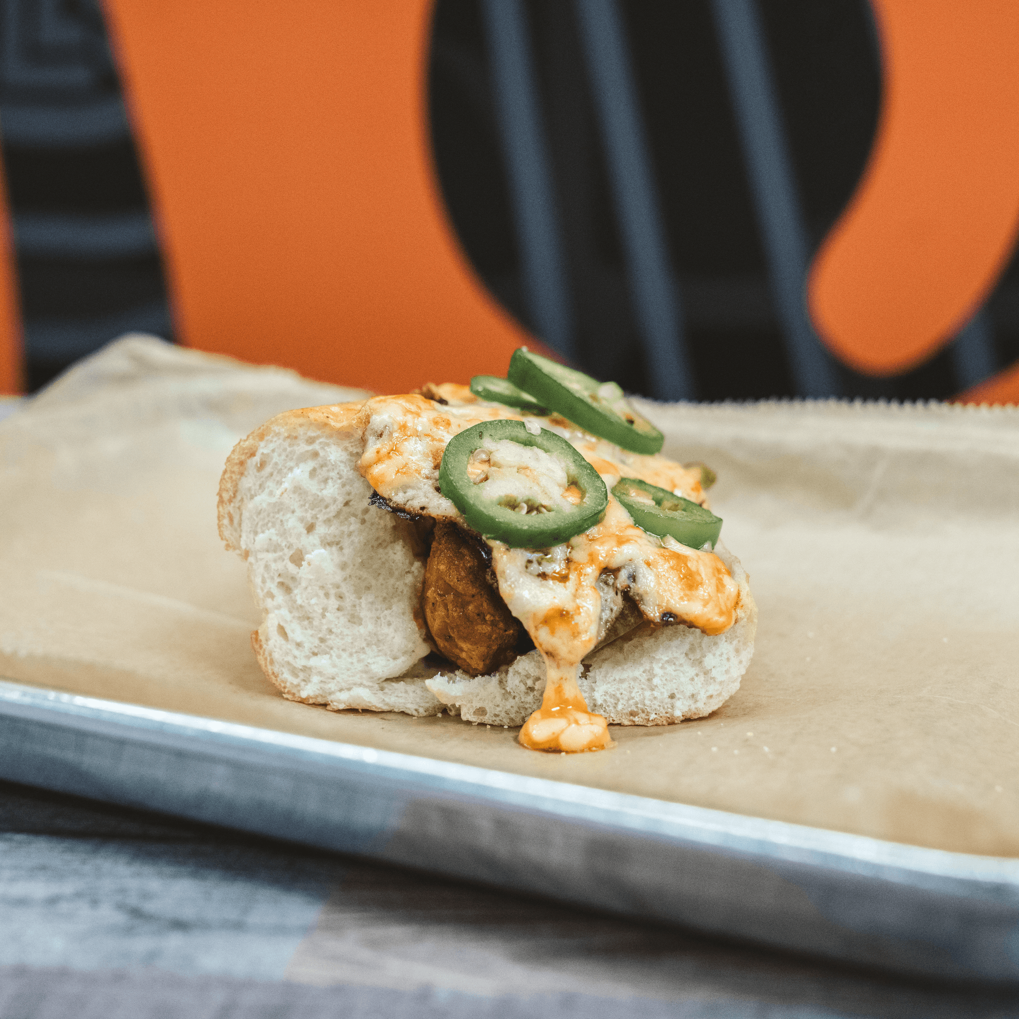 Our tender sandwich with no slaw, but with melted Buffalo Cheese Curds and fresh jalapenos!