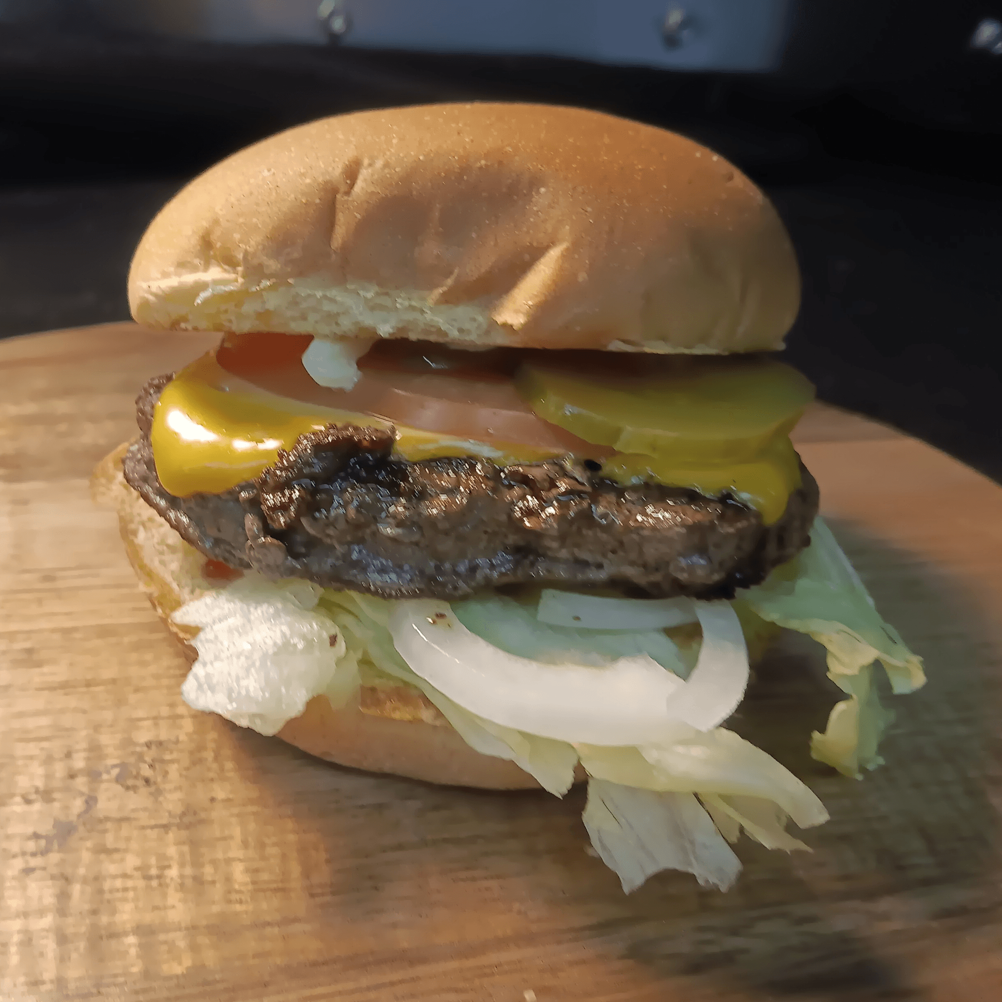 Juicy, grilled beef topped with melted cheese and classic fixings—lettuce, tomato, pickle, onion, ketchup, and mustard
