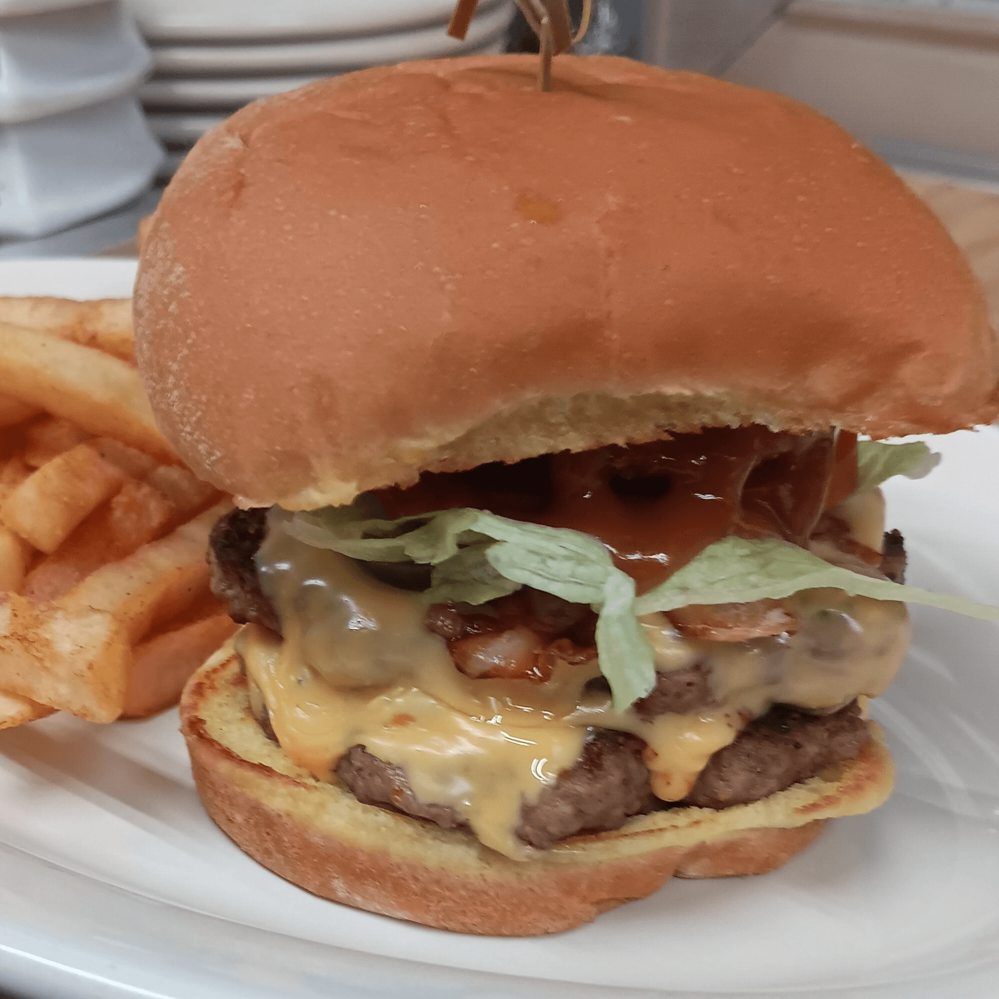 Our signature burger. 2 seasoned beef patties, American cheese, lettuce, tomato, pickles, house made sauce and topped with a deep fried onion ring